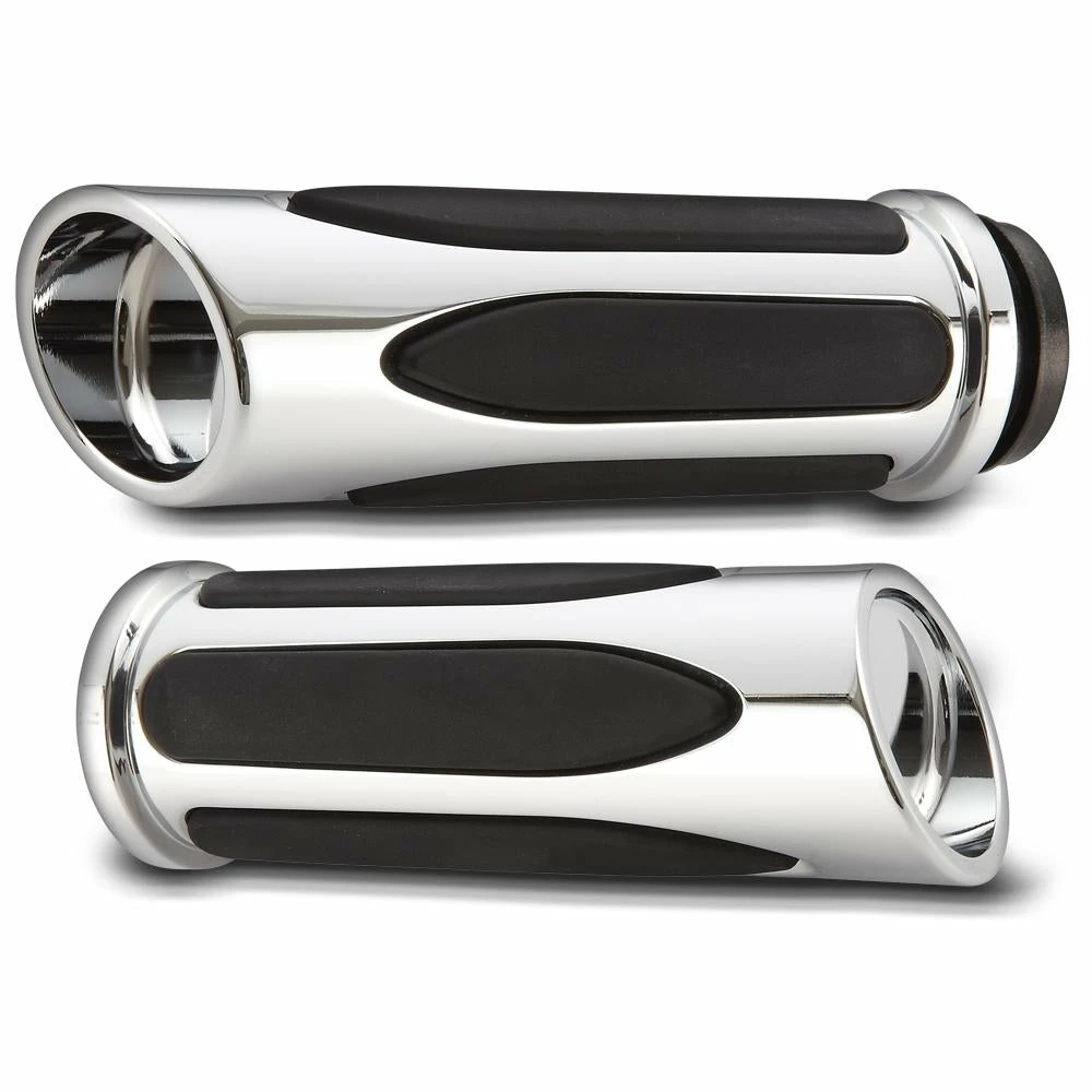 A stylish blend of form and function. Features: Conical billet grip bodies are machined to perfection and finish in Chrome finish. Innovative rubber inserts have a soft air cushion feel that dampens vibration for a comfortable ride. Grips have a slightly larger diameter than stock , which helps with Carpal Tunnel and hand fatigue during long rides Sold in pairs Fitment: Cable Style Fly-By-Wire
