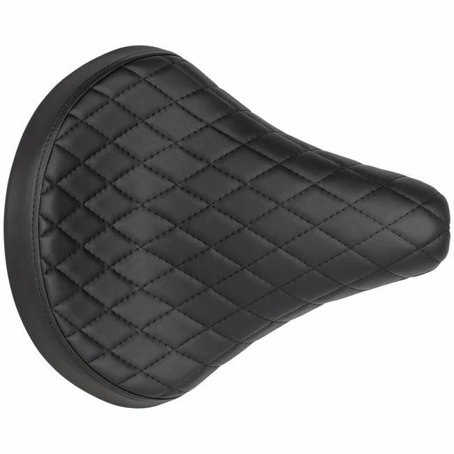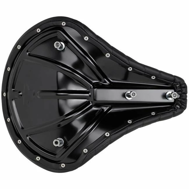 Construction: 1/8-inch thick (3mm) stamped steel pan with welded carriage bolts on nose and tail for spring and hinge mounting. One inch thick molded polyurethane foam padding with hand-stitched heavy-duty vinyl cover. Four carriage bolts are welded onto the bottom of the pan to facilitate spring and seat hinge mounting. Your frame may require modifications to nose hinge and spring bungs for proper fitment.