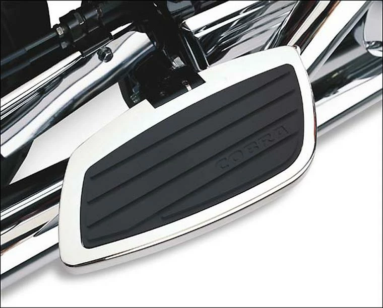 Why should the rider have all the comforts of home? Cobra’s Billet Swept Rear Floorboards give your passenger the royal treatment with real stretch-out room, vibration-absorbing rubber inserts and folding mounts for the times you must ride solo. A classy fluted design on the underside of the boards makes them look great up or down