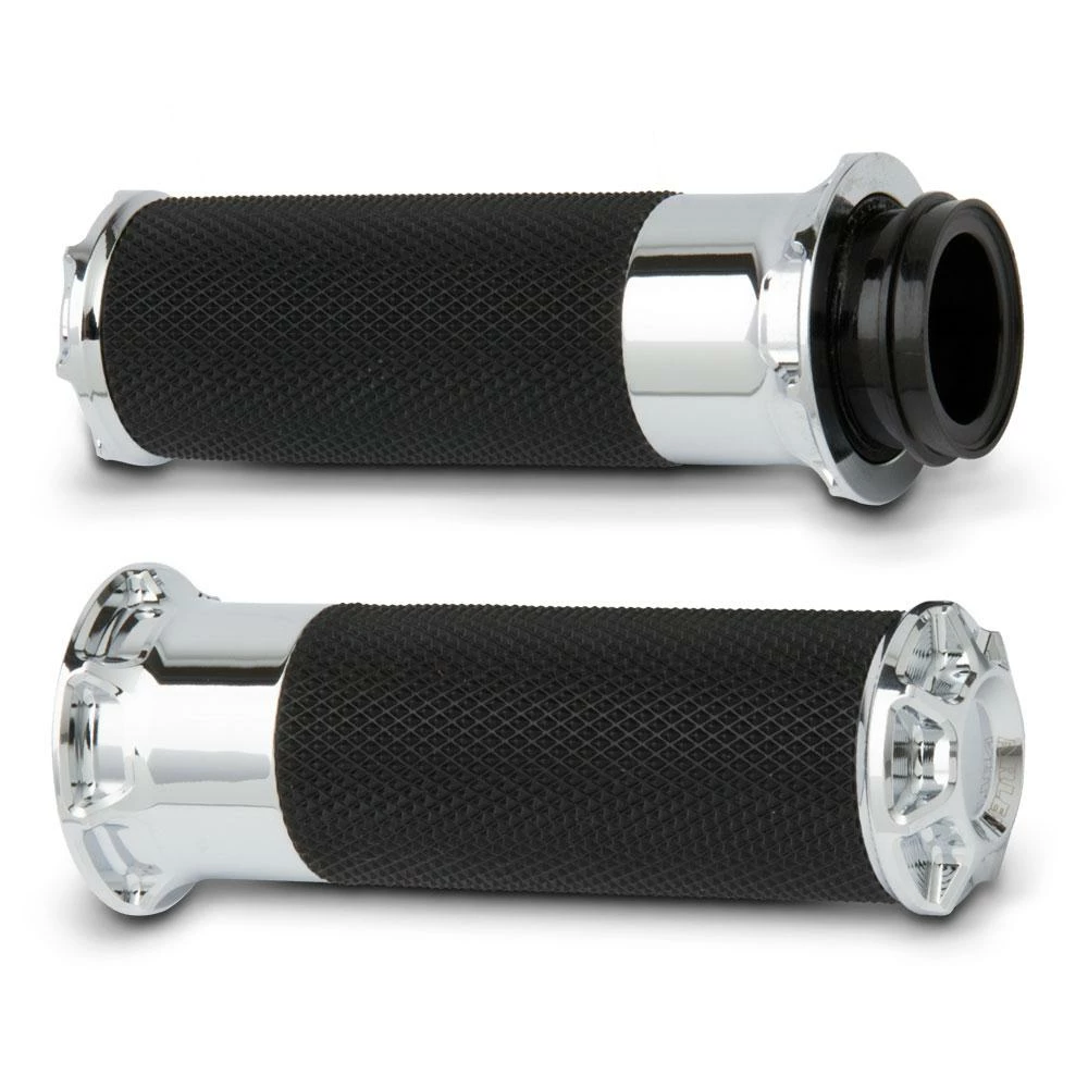 Fusion Series Grips are perfect fusion of grip, style, and comfort. Features: Knurled grip rubber offers excellent hand traction to take full control of your motorcycle. The collar and end cap are intricately machined from billet aluminum and logo is laser engraved. Grips include an installed throttle sleeve, grip glue, and simple to follow instructions. Chrome finish. Sold in pairs Fitment: Cable style Fly-By-Wire