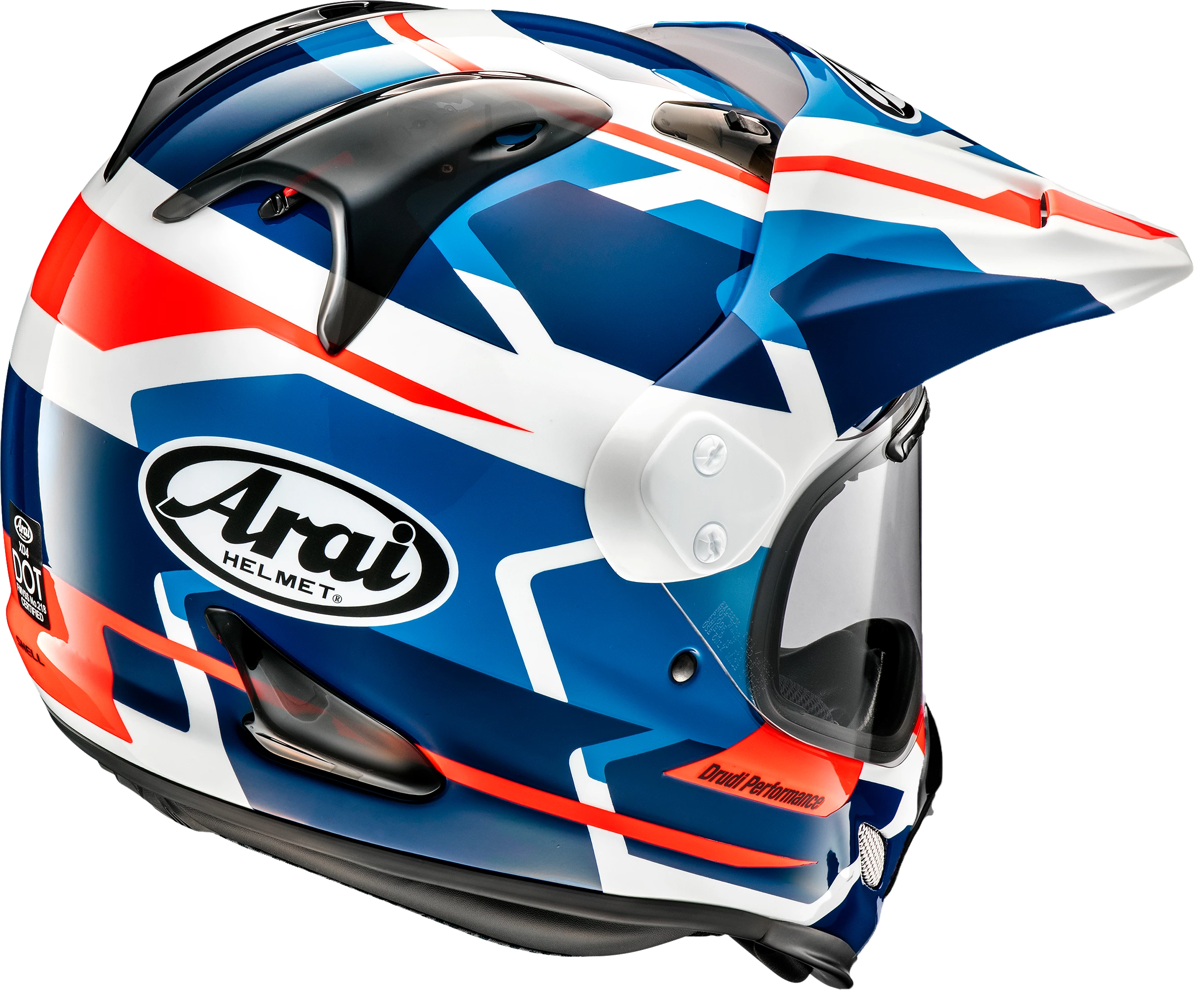 The Twin-Cam Shield Pivot System on the Arai XD helmet allows the faceshield to operate fully under a peak that can be lowered for better aerodynamics. Its high-flow peak channels air directly into the front vents. Dual TDF3 top intake vents and Double Delta bridged exhaust vents are designed to draw a significant volume of air from the helmet interior. The shell, constructed of fiberglass composite, is stronger and lighter and allows the use of softer, less dense liner materials for increased rider comfort. An efficient chinbar vent, with interior and exterior controls, flows fresh air to the mouth area or across the shield interior to help prevent fogging, while large chinbar side exhaust vents draw out additional hot air. Arai XD series helmets can be configured with shield and peak, peak only, for use with goggles, or shield only.