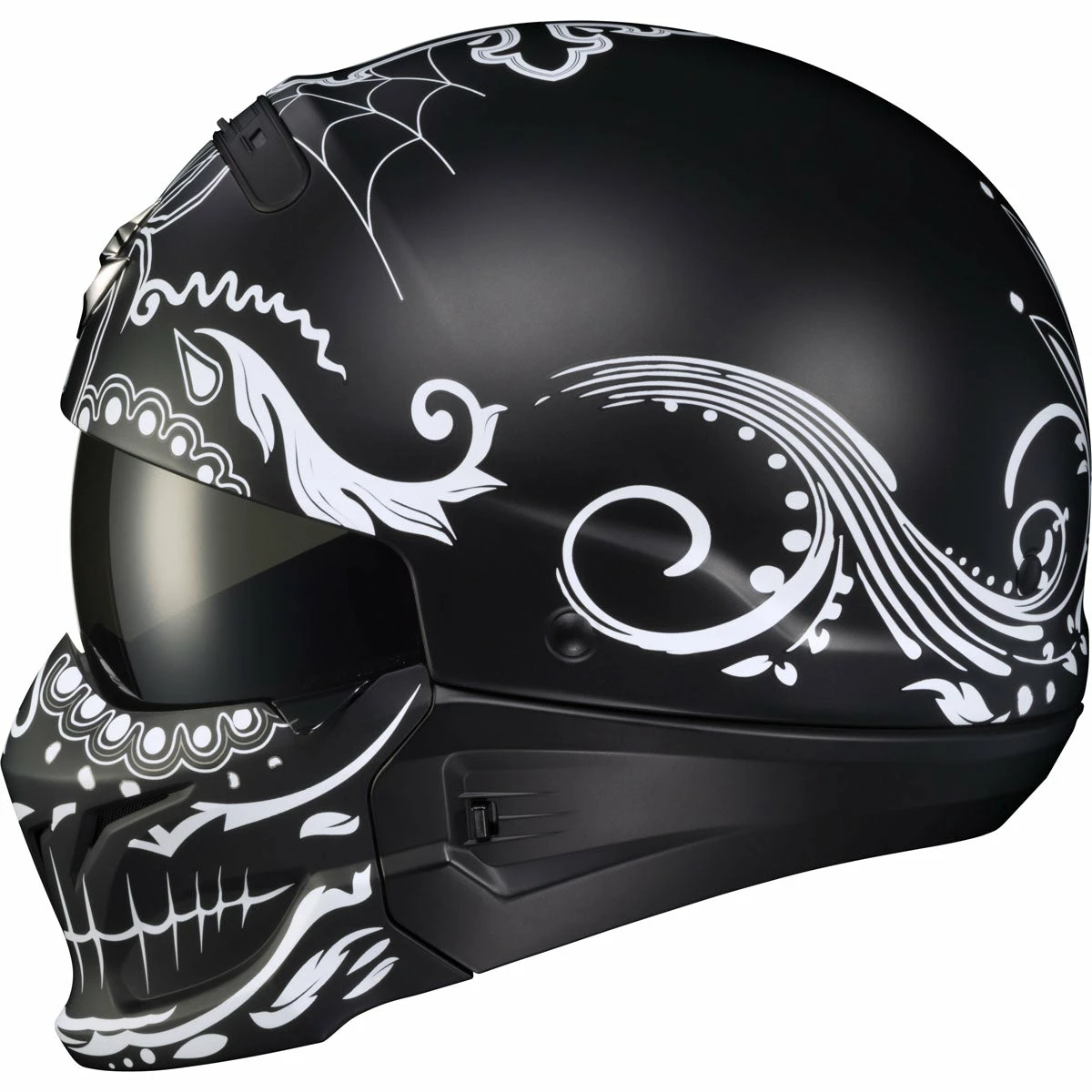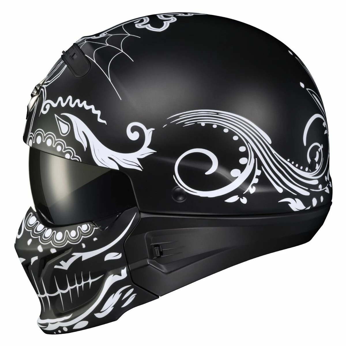 Meant to disrupt the norm, this radical design can be converted to work with any type of bike. We started with a half helmet and added an integrated drop-down sun visor for protection from sunlight. A rear comfort sleeve allows you to convert the helmet to a ¾ open-face and then attach the included front mask and you’ve got one, aggressive looking full face helmet.