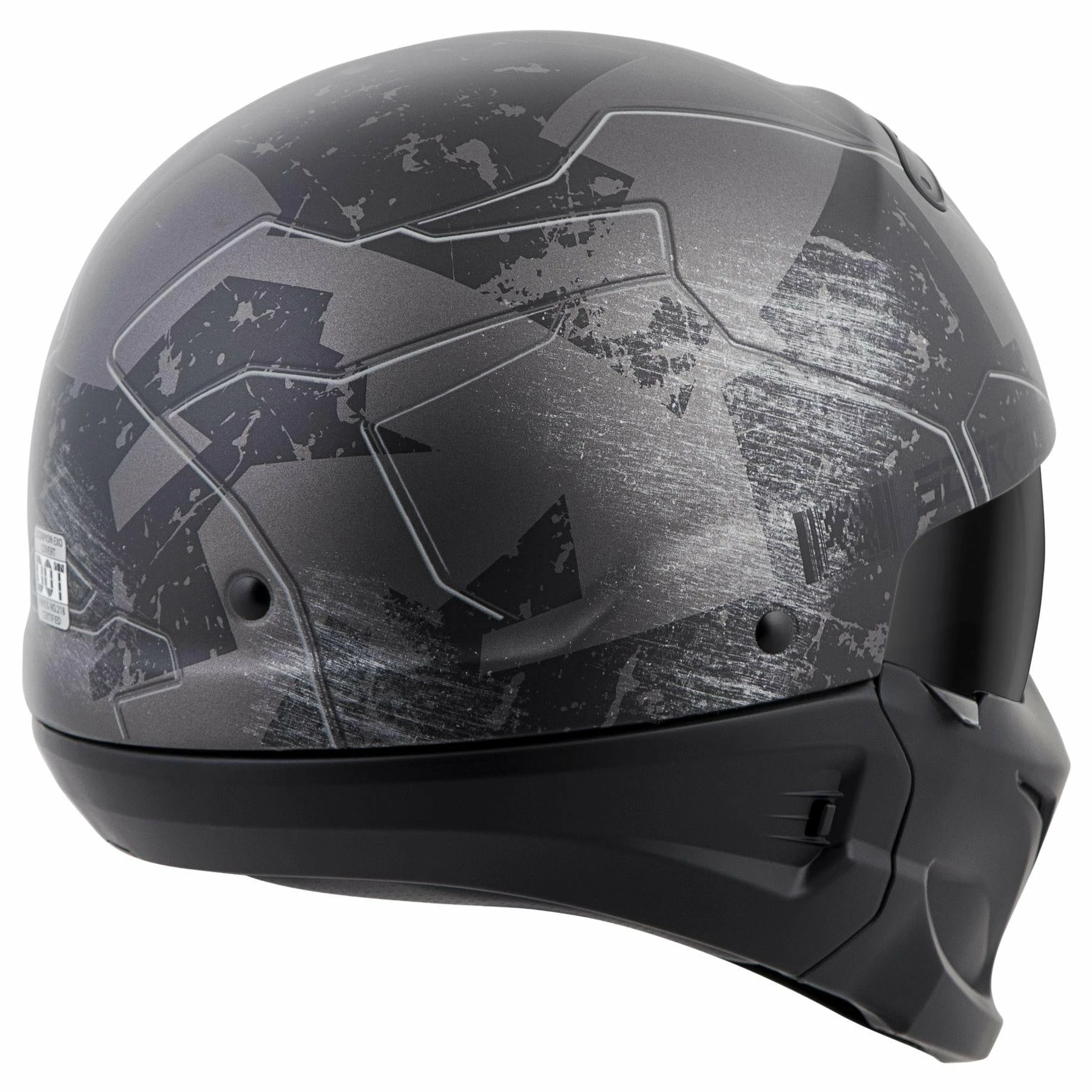 Meant to disrupt the norm, this radical design can be converted to work with any type of bike. We started with a half helmet and added an integrated drop- down sun visor for protection from sunlight. A rear comfort sleeve allows you to convert the helmet to a ¾ open-face and then attach the included front mask and you’ve got one, aggressive “bad ass” looking helmet.