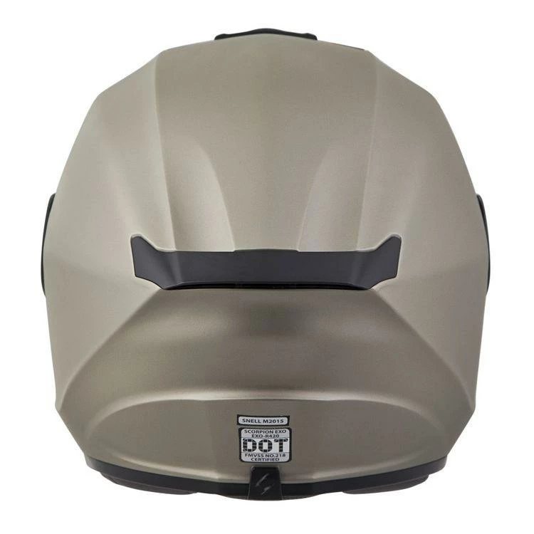 The EXO-R420 helmet continues to set a new standard for Scorpion EXO®’s full face street helmets at a very competitive price point. An all new advanced LG® polycarbonate shell is more aerodynamic and smaller resulting in an ultra lightweight SNELL-approved helmet. The aero tuned ventilation system uses a large top vent and mouth vents engineered to allow more airflow to the riders head while maintaining low noise levels. The EXO-R420 now features our new Elliptec™ II faceshield with a latching shield locking mechanism located in the lower center of the shield. This makes the faceshield more secure and provides a tighter seal against the gasket. The faceshield can easily be removed without tools, and the EverClear® No-Fog coating helps keep your vision clear in cold and damp environmental conditions. The KwikWick® II comfort liner is moisture wicking, anti-microbial, quick drying and can be easily removed and is machine washable.