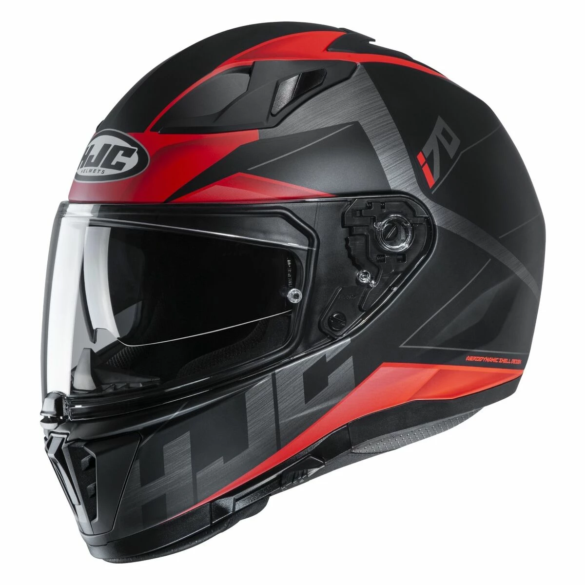 The i70 is a modern and sleek sport-touring helmet composed of HJC’s advanced polycarbonate material. The full-face shell is noticeably more compact and lighter than its predecessor, the IS-17. The i70 features an inner, drop-down sun visor with a new, easy-to-use lever. Top vents optimize ventilation into the interior air channels and out through the exterior exhaust vent with an aerodynamic spoiler design.