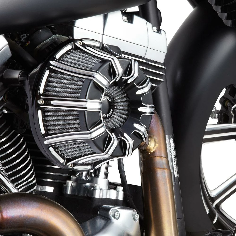 The 10-Gauge Inverted Series air cleaner combines the patented Big Sucker™ technology and an inverted filter top that maximizes airflow by pulling in air from the face of the air cleaner, as well as the traditional method of pulling air from the sides. Each kit is machined entirely from forged billet aluminum to provide the best performance and style.