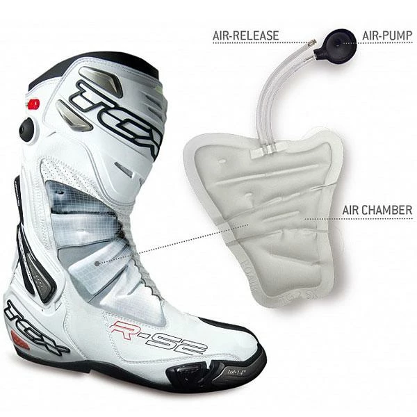 - Precise Air Fit System: The exclusive P.A.F.S. system used in the new R-S2 offers motorcyclists a revolutionary precise fit system that can be personalized depending on the specific foot shape and as simply as “inflating” the air chamber. The air chamber, completes the boot’s safety features (represented by T.C.S. and M.C.S.), protecting the instep and shinbone in the event of impact.