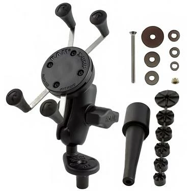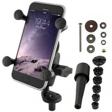 The Fork Stem Mount consists of a fork stem base, short double socket arm and universal X-Grip® holder. The included X-Grip® cradle has a clean and clever four leg design that sports great holding power without hiding your phone behind foam pads and plastic. The spring loaded X-Grip® holder expands and contracts, allowing for a perfect custom fit of your cell phone.